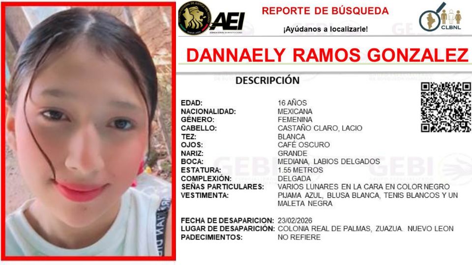 La angustia se apodera de una familia en el norte del área metropolitana. Desde el pasado lunes 23 de febrero, no se sabe nada de Dannaely Ramos González, una adolescente de 16 años que fue vista por última vez en la colonia Real de Palmas, en el municipio de Zuazua.