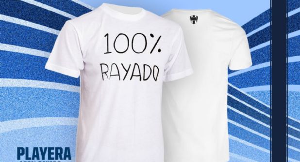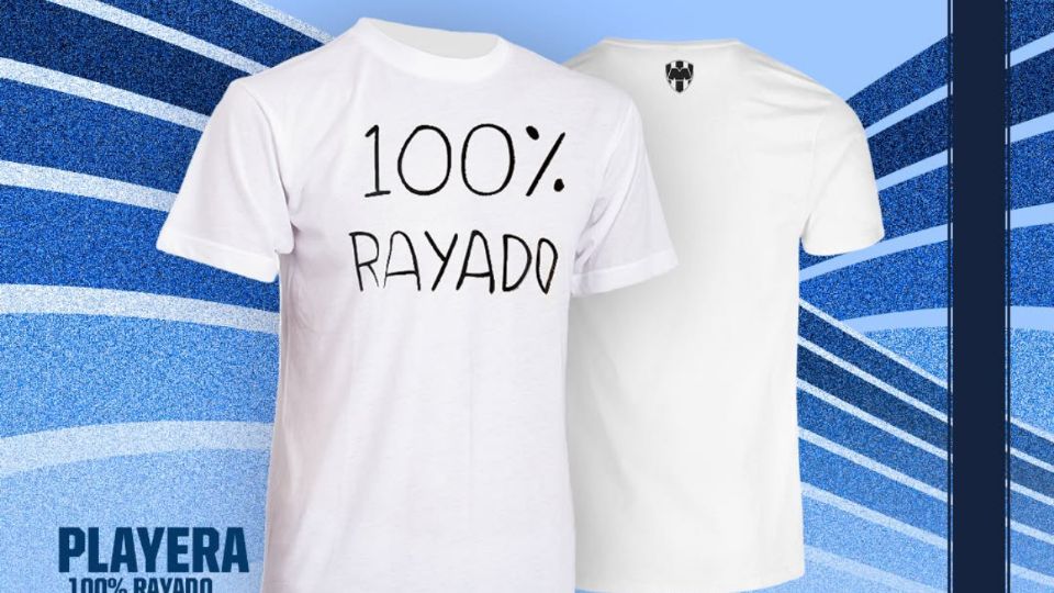 Se trata de una playera de algodón, completamente blanca, con una tipografía sencilla en color azul o negro que lleva impresa la frase: "100% RAYADO" .