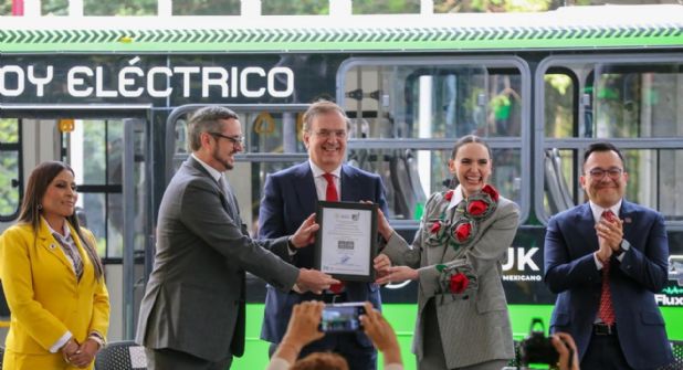 El secretario de Economía Marcelo Ebrard, junto con Altagracia Gómez coordinadora del Consejo Asesor de Desarrollo Económico de la Presidencia entregaron esta certificación, al autobús eléctrico 100 por ciento mexicano llamado, Taruk.