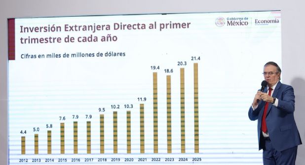 “Esto es cómo viene evolucionando desde 2012 la Inversión Extranjera Directa en México. Como ustedes verán, el último dato es 21.4 miles de millones de dólares. Es el más alto histórico que hayamos tenido, 21 mil 400 millones de dólares. Esto crece respecto a todos los años anteriores. Es muy buena noticia porque es un trimestre que ha sido complejo en el escenario internacional y, sin embargo, esta inversión que creció en lo que llevamos de 25 respecto a los años anteriores, significa que tenemos más reinversión y más capital llegando a nuestro país por todas las vías. Es muy buena noticia”, señaló.