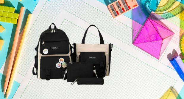 Todo el paquete está diseñado con materiales resistentes, ideales para cualquier estudiante. El diseño es colorido, moderno y práctico para organizar útiles, alimentos y objetos personales. De 499 pesos mexicanos, tiene precio final de 169.99 pesos mexicanos.