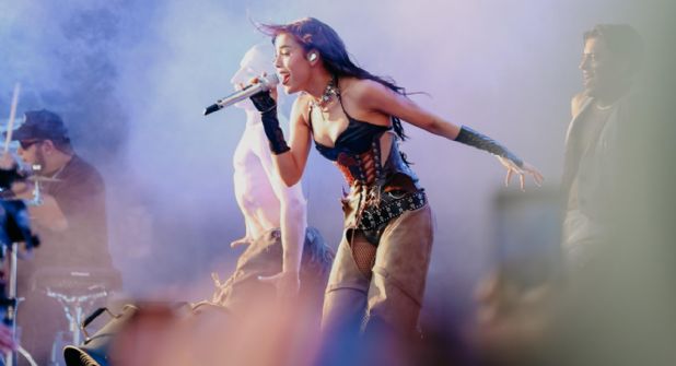 Danna hizo una espectacular entrada al escenario Tecate Original con la ayuda de un elevador, acompañada de su cuerpo se dio inició a su presentación en el Festival Tecate Pa’l Norte 2024 cantando “Mala Fama”.