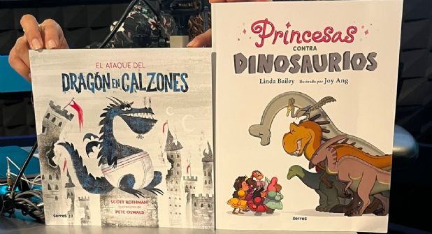 La primera recomendación se llama “Princesas contra dinosaurios” es un libro que cuenta una historia muy divertida: “las princesas se dan cuenta que el mundo de los dinosaurios puede ser muy entretenido y se suben en el lomo de ellos, ahí el Tiranosaurio Rex también se da cuenta que puede ser también muy agradable el mundo de las princesas, comienzan a ponerse diademas, collares, etc, es una historia que te enseña a compartir y estar en armonía”.