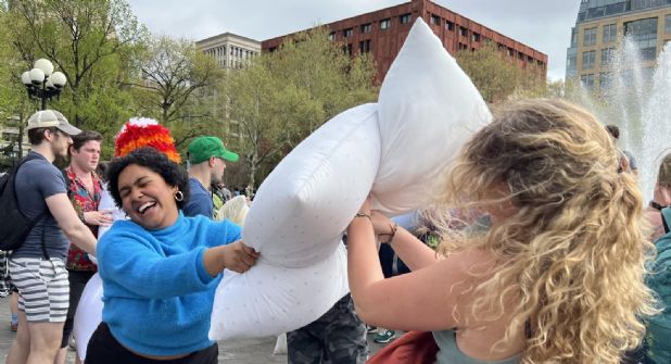 Decenas de personas de todas las edades fueron este sábado a la céntrica plaza neoyorquina de Washington Square Park armados de sus mejores cojines para participar en una amigable pelea de almohadas, evento que se celebra anualmente en la Gran Manzana.