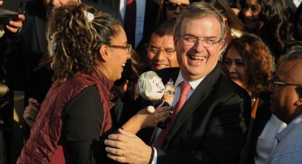 El secretario de Relaciones Exteriores se mostró contento por la recepción que tuvo en la Cámara de Diputados, mientras sostenía un “carnalito” (muñeco con su figura), que le fue regalado.