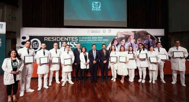 Al encabezar la Ceremonia de Clausura del Ciclo Académico 2022-2023 e inauguración del Ciclo Académico 2023-2024 de los Cursos de Especialización Médica ante mil residentes reunidos en la Unidad de Congresos del Centro Médico Nacional (CMN) Siglo XXI, Zoé Robledo destacó la cifra récord para 2023 de 24 mil 212 personas en formación.