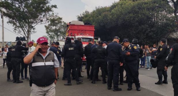 Familiares y amigos de los padres del niño Itan, de 10 meses de edad, quien fue golpeado por una profesora en una estancia infantil, mantienen bloqueada la circulación en la carretera federal México-Cuernavaca a la altura del poblado de San Andrés Totoltepec, alcaldía Tlalpan..