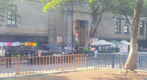 Los inconformes no obstruyen vialidad, sólo ocupan una parte de la banqueta de avenida Pino Suárez.