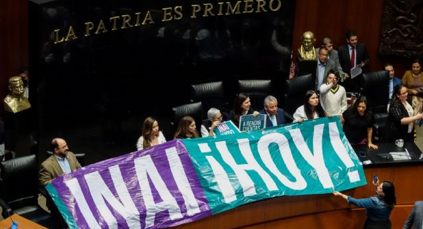 Al grito de “transparencia, transparencia”, los senadores del PAN colocaron un par de lonas con las leyendas “INAI Hoy” y “Comisionados Ya”, recibiendo el apoyo de un grupo de colectivas feministas, quienes desde uno de los balcones demandaron también la aprobación de la Ley 3 de 3 contra la violencia de género.