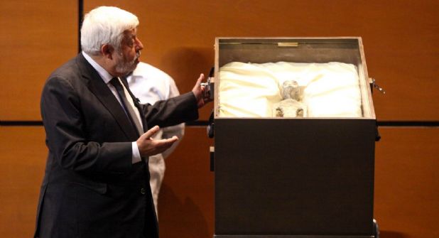 El punto más álgido del evento que abarrotó el Salón Legisladores del recinto parlamentario, encabezado por el periodista especializado, Jaime Maussan, llegó cuando se exhibieron en dos cajas selladas, los presuntos restos de seres “no humanos”.