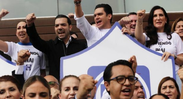 Dirigentes, legisladores y militantes del PAN se manifestaron frente al Instituto Nacional de Transparencia, Acceso a la Información y Protección de Datos Personales (INAI) contra la reforma que impulsa Morena para desaparecer dicho organismo.