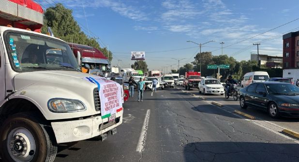 En la Calzada Ignacio Zaragoza, continuación de la autopista México-Puebla, transportistas con camiones de carga y autobuses foráneos mantienen cerrada la circulación hacia la Ciudad de México.