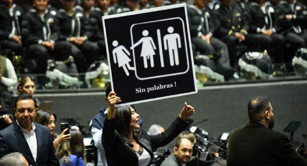 Ello, al protestar con un cartel donde mostró tres siluetas: una de un hombre y otra de una mujer con pene, desplazando a la figura de una mujer.