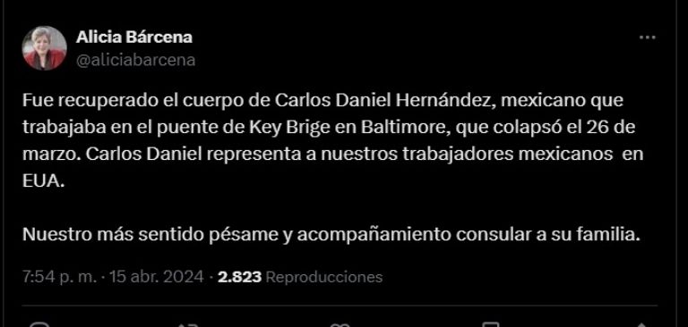 A través de su cuenta de ‘X’, antes Twitter, la canciller emitió sus condolencias a los familiares de este connacional, quien perdió la vida luego del colapso de este puente el pasado 26 de marzo.