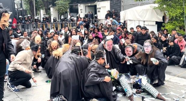 Estudiantes de diversas instituciones realizaron un performance junto a las instalaciones del Senado sobre la calle de Madrid.