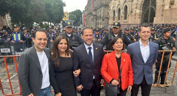 Los senadores de Movimiento Ciudadano arribaron a pie a la Antigua Casona de Xicoténcatl e incluso se tomaron un tiempo para fotografiarse con un par de artistas urbanos caracterizados como personajes de la Revolución.