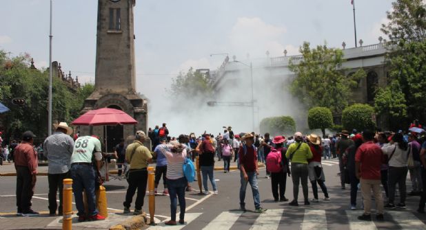 Este miércoles, mientras se llevaba a cabo el diálogo en Bucareli, afuera, integrantes de la sección 14 de Guerrero y de organizaciones sociales lanzaron piedras y rompieron cristales del edificio, lo que provocó la respuesta del personal de seguridad que lanzó polvo de extintores a los manifestantes, generando una enorme nube de humo blanco.