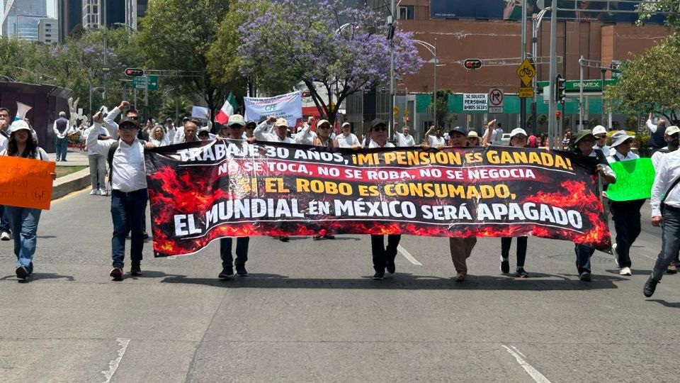Jubilados de la Comisión Federal de Electricidad, Pemex, Banobras y Luz y Fuerza protestaron frente al Senado de la República contra la reforma constitucional que busca acabar con las llamadas “pensiones doradas”.