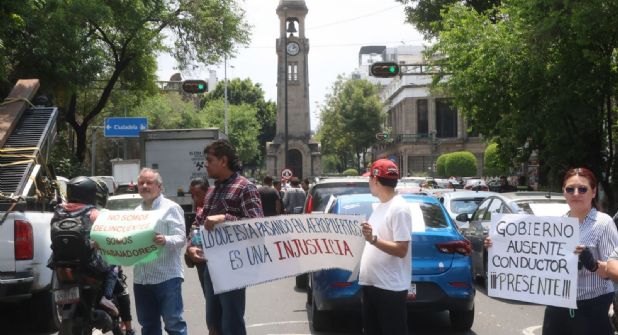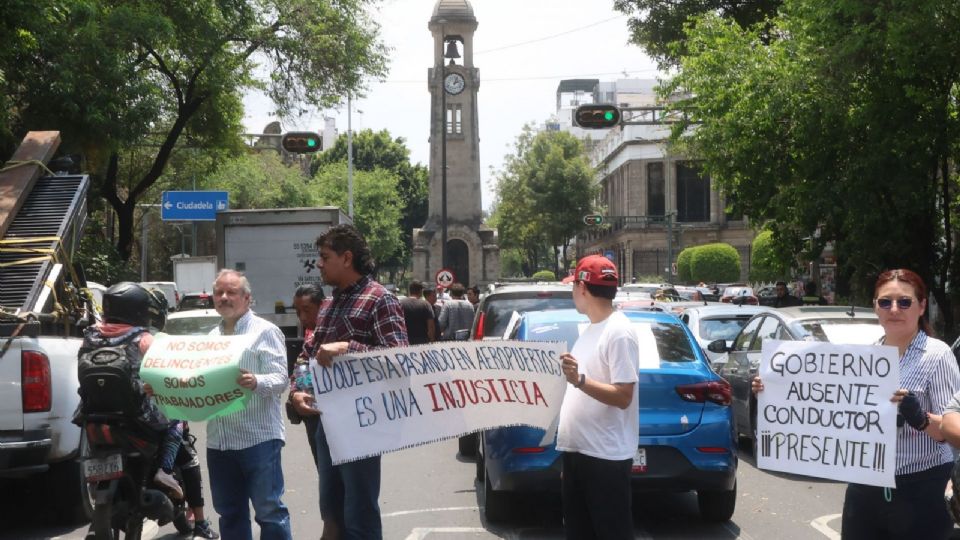 Al grito de “gobierno ausente, conductor presente”, choferes de vehículos de alquiler por aplicación se manifestaron frente a la Secretaría de Gobernación para exigir piso parejo y les permitan abordar pasajeros en las dos terminales del Aeropuerto Internacional de Ciudad de México (AICM).