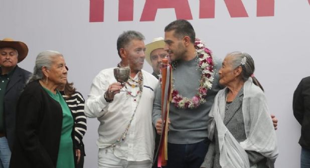 El aspirante a Coordinador de Defensa de la Cuarta Transformación en la Ciudad de México, Omar García Harfuch recibió de líderes de los pueblos originarios el Bastón de Mando, por lo que le mostraron un músculo importante para alcanzar la candidatura de Morena.