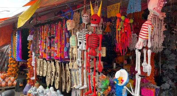 Predominan las artesanías mexicanas sobre los productos para los festejos de Halloween o Noche de Brujas, aunque estos acaparan la atención.