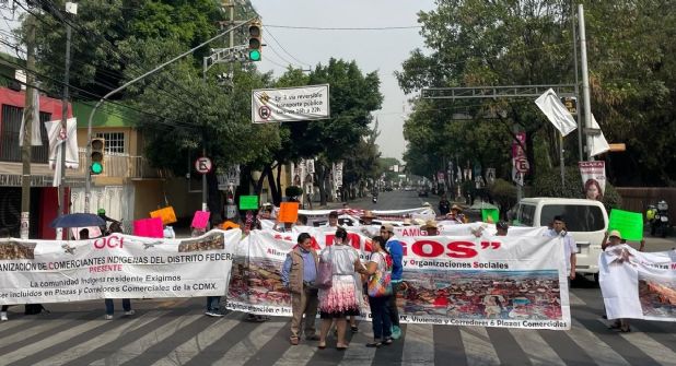 La Alianza Mexicana de Indígenas y Grupos de Organizaciones Sociales (AMIGOS) realizan una protesta en el cruce de Canal de Churubusco, alcaldía Iztacalco, límites con Iztapalapa.
