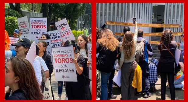 Integrantes de la Organización Movimiento México sin Toreo, realizaron una protesta frente a la Secretaría de Agricultura y Desarrollo Rural (SADER) para exigir el fin de las corridas de toros en todo el país.
