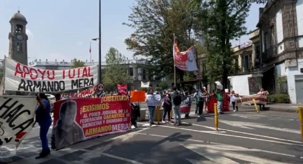 Provenientes del estado de Hidalgo, un grupo de personas se manifiesta en inmediaciones de la Secretaría de Gobernación con el cierre de la avenida Bucareli al cruce con la calle Atenas, colonia Juárez, alcaldía Cuauhtémoc.