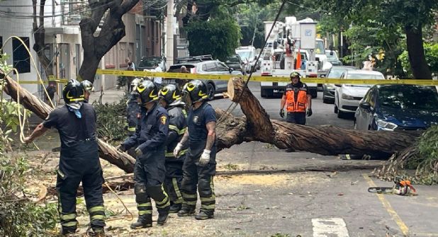 El personal de bomberos de la estación Benito Juárez realiza maniobras para el retiro del árbol.