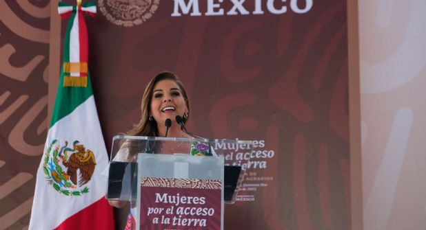 La gobernadora Mara Lezama Espinosa acompañó al presidente Andrés Manuel López Obrador en la entrega de documentos del programa “Mujeres por el Acceso a la Tierra”, en cumplimiento de sentencias agrarias en favor de viudas de ejidatarios en el estado de Quintana Roo, un hecho histórico para la justicia social de las mujeres.