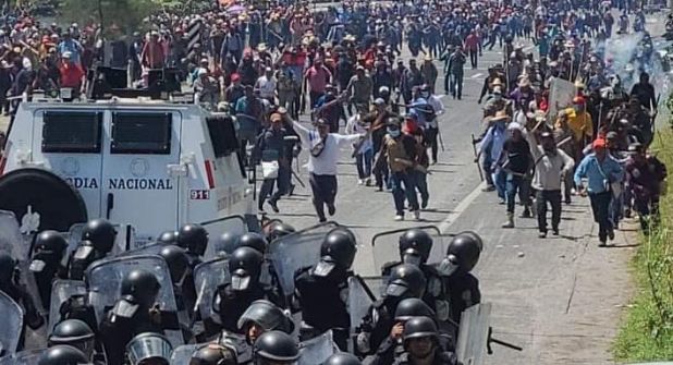 Pero los pobladores, armados con piedras, machetes, palos y tubos, derribaron las vallas metálicas, mientras que las fuerzas del orden respondieron con gas lacrimógeno el enfrentamiento duró al menos tres minutos.