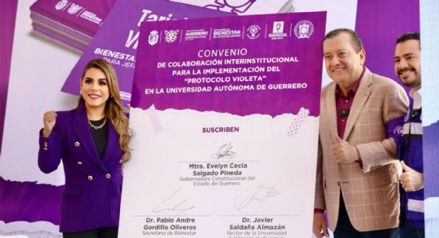 En este evento, la gobernadora Evelyn Salgado firmó un convenio de colaboración con el rector de la Universidad Autónoma de Guerrero, Javier Saldaña Almazán, para implementar acciones conjuntas que fortalezcan el desarrollo del Protocolo Violeta en la máxima casa de estudios y difundir los componentes del programa entre la comunidad universitaria.