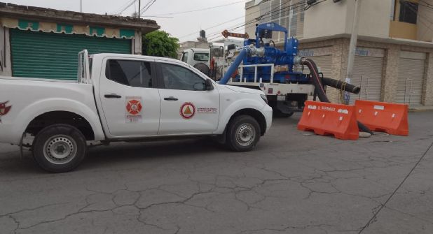 La Comisión del Agua del Estado de México (CAEM) continua con las labores de achique de agua pluvial, desazolve de la red de drenaje, limpieza de vialidades, e inició el lavado y desinfección de cisternas de agua potable utilizando siete camiones de presión-succión, un camión de volteo, tres retroexcavadoras, dos equipos especializados de bombeo, una bomba Thomson de 8” de diámetro, nueve bombas de ½ Hp, dos minicargadores y 38 brigadistas.