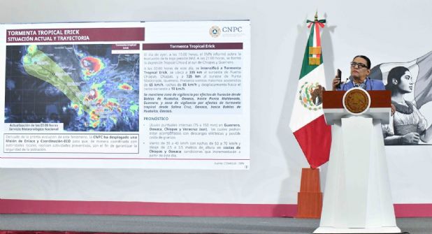 La coordinadora nacional de Protección Civil, Laura Velázquez, informó que la tormenta tropical Erick que avanza por el Pacífico tiene una elevada probabilidad de convertirse en huracán categoría 2 antes de tocar tierra en territorio nacional.