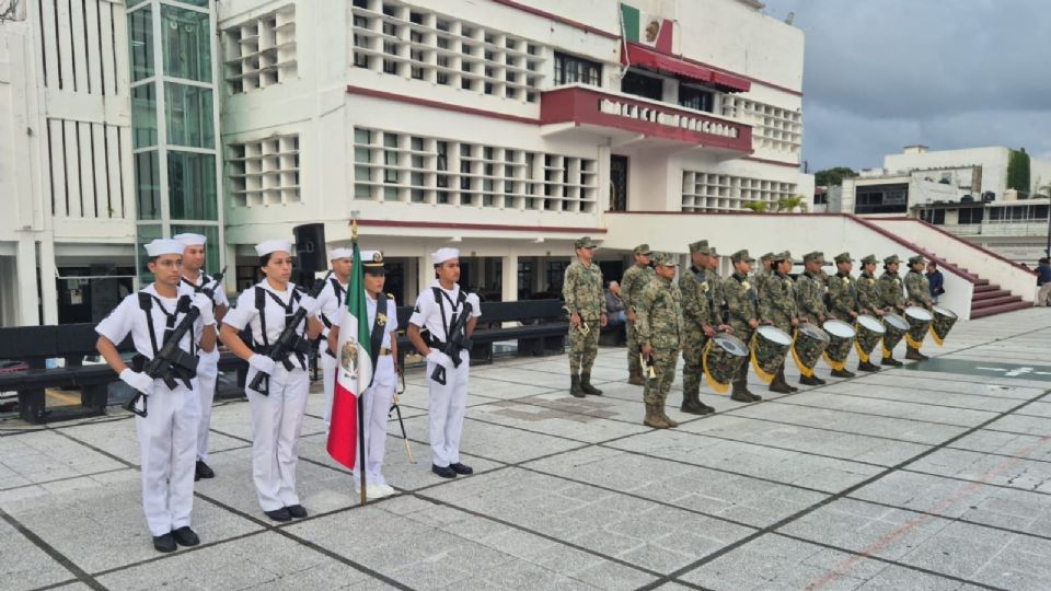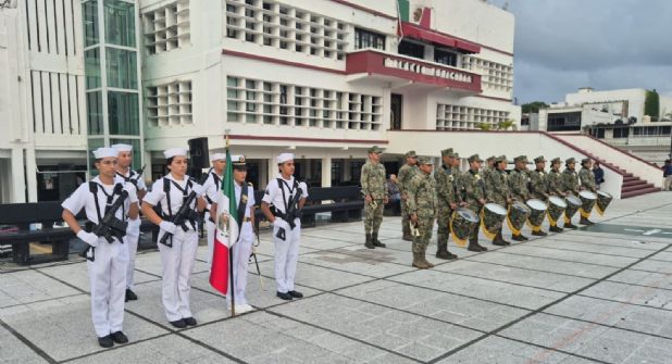 La MARINA informó que destacó la presencia de la Escolta de Bandera, reflejó de respeto absoluto a nuestra Enseña Nacional y la Banda de Guerra, encargada de marcar el compás de la ceremonia.