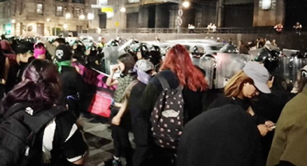 Las manifestantes, algunas de ellas encapuchadas, exigen justicia para una joven llamada Alin Yashica, de 16 años de edad, quien habría sido víctima de abuso sexual por elementos de la Guardia Nacional y de la Policía Municipal de Chimalhuacán, en el Estado de México, en mayo de 2019.