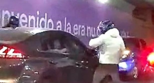 Al bajar la velocidad y detenerse, uno de los implicados, desciende de la motocicleta se aproxima del lado del copiloto y con un objeto rompe el vidrio de la ventana, en tanto, otro sujeto intercepta al conductor.