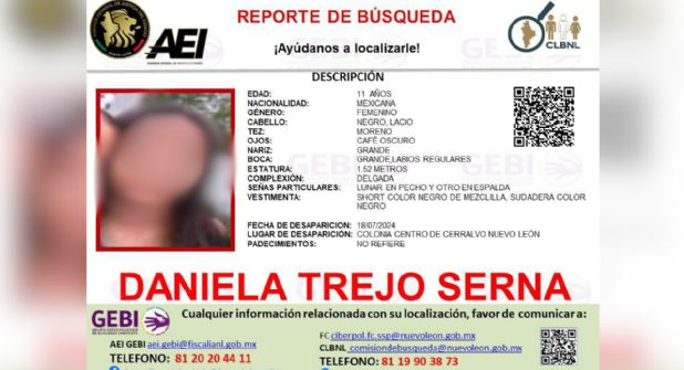 La Fiscalía General de Justicia del Estado informó en un comunicado que el cuerpo de la menor, identificada como Daniela Trejo Serna, fue encontrado en un predio y ya fue detenido el principal sospechoso.