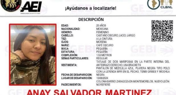 La ficha de búsqueda describe a Anay como una mujer de 25 años, con cabello castaño oscuro, largo y lacio, y ojos de color café oscuro. Como seña particular, tiene un tatuaje de dos mariposas en la parte interna del antebrazo derecho y usa brackets.