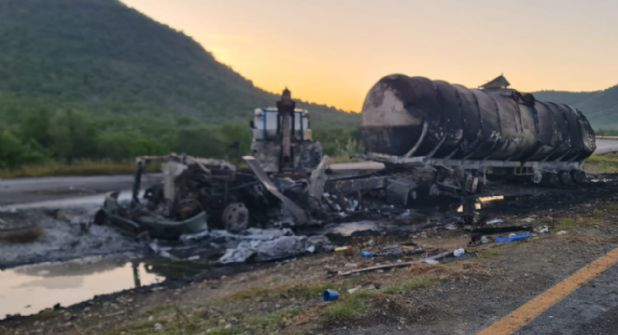 Mientras tanto, la unidad que transportaba 33 mil litros de derivado de petróleo, quedó volcada sobre el costado izquierdo en el camellón central que divide la circulación de la vía federal.