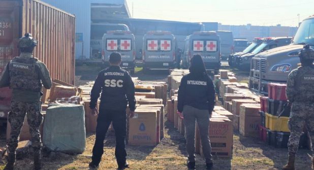 Además, 2 mil 100 cajas de medicamento -posiblemente- controlados; 900 vapeadores con cannabis; y un arma de fuego calibre .9 milímetros.