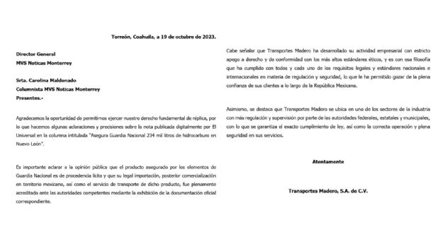 De acuerdo a un documento que hicieron llegar MVS Noticias, la empresa tiene los permisos correspondientes para su legal importación, posterior comercialización en territorio mexicano, así como el servicio de transporte de dicho producto; esto fue plenamente acreditado ante las autoridades competentes mediante la exhibición de la documentación oficial correspondiente.
