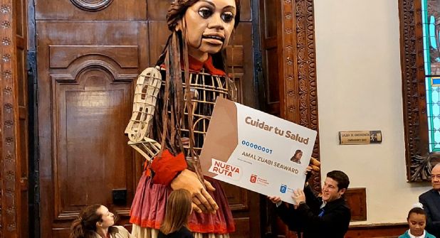 Este viernes el gobernador del Estado, Samuel García Sepúlveda, dio la bienvenida a la muñeca gigante Amal, símbolo mundial de los derechos humanos y los niños refugiados.