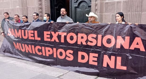 Por último, los ediles bloquearon el acceso trasero del Palacio de Cantera con una manta con la leyenda "Samuel Extorsiona Municipios de Nuevo León".