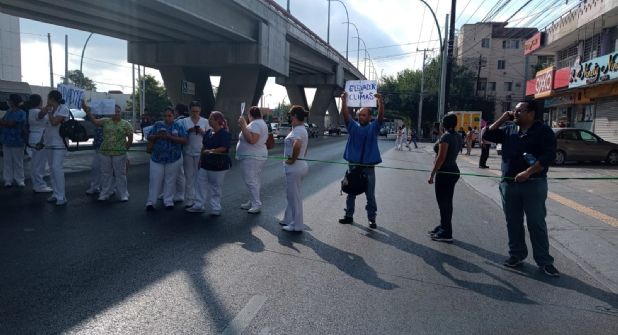 Empleados de la Clínica 25 del IMSS protestan bloqueando la Avenida Lincoln en Monterrey.