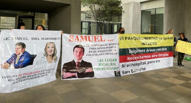 Vecinos de la zona norte del Monterrey se manifestaron en las afueras del Congreso del Estado para exigir que el Hospital de Oncología Infantil, cuyo proyecto, es del gobierno de Nuevo León no se construya en el Parque Libertad, en donde antes estaba el Penal del Topo Chico.