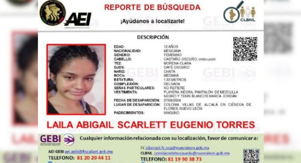 Luego de que el pasado 1 de octubre la Fiscalía General de Justicia de Nuevo León emitiera el reporte de búsqueda de Laila Abigail Scarlett Eugenio Torres, la menor desaparecida en Ciénega de Flores, se ha logrado determinar que ella quería llegar a Culiacán.