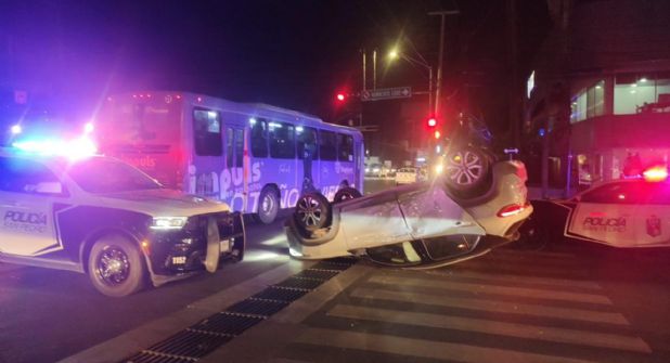 Un accidente vehicular se registró en la intersección de Humberto Lobo y José Vasconcelos, en la colonia Del Valle de San Pedro, Nuevo León, cuando un camión de ruta colisionó con un vehículo particular, provocando que este último volcara.