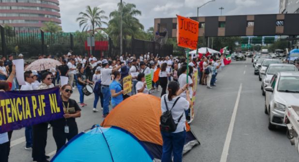 Un grupo de trabajadores del Poder Judicial salió de nueva cuenta a las calles y bloqueó la avenida Fundidora la mañana de este martes con la amenaza de acampar en medio de la arteria.
