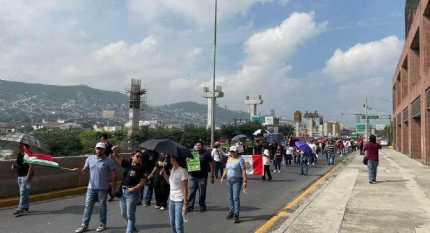 Alrededor de 250 trabajadores iniciaron su marcha de espaldas desde el cruce con las avenidas Zaragoza y Ocampo para tomar Constitución y llegar a las oficinas del Juzgado ubicado a un costado de la avenida Cuauhtémoc.